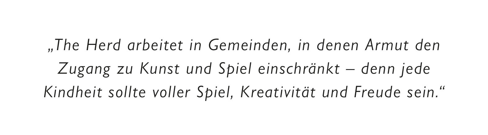 Seit 2016 hat The Herd über 94.000 Menschen mit Shows, Installationen, Workshops und Spielveranstaltungen erreicht und über 5.000 Kinder in spielerische, mitgestaltende Kunstprojekte eingebunden. Wir hoffen, dass sie mit unserer Unterstützung noch mehr Kinder und deren Familien erreichen und so zu stärkeren und glücklicheren Gemeinschaften beitragen werden.