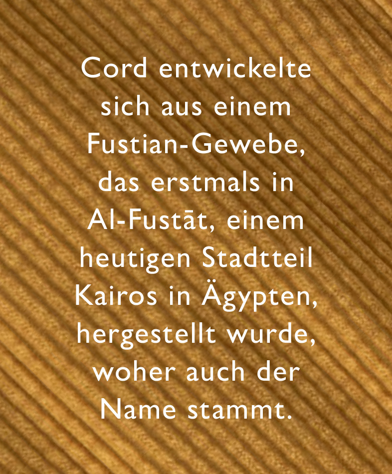 Einer unserer Lieblingsstoffe für Herbst und Winter, Cord, ist sofort an seiner unverwechselbaren, gerippten Textur erkennbar, die an parallel nebeneinandergelegte Kordeln erinnert. Ursprünglich aus dem alten Ägypten stammend, später von der britischen Monarchie übernommen und von der Boheme der 70er-Jahre wiederentdeckt, bleibt er ein zeitloses Standardmaterial in unseren Kollektionen.